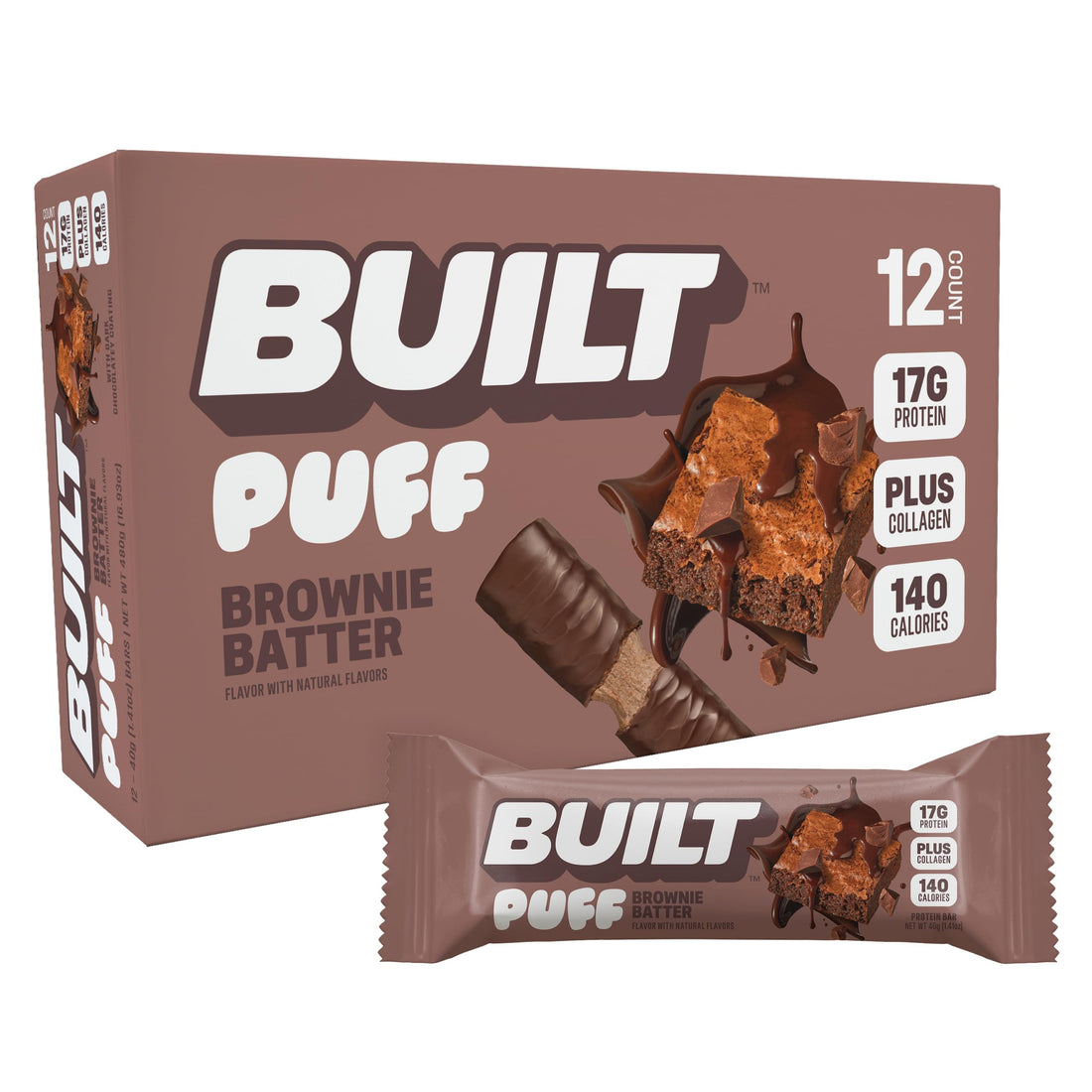 Built Bar, Puff Protein Bars, Brownie Batter Puff, 17g Protein Snacks, On-The-Go Bars, Only 140 Calories, 6g Sugar, Collagen, Gluten Free, 12 Count