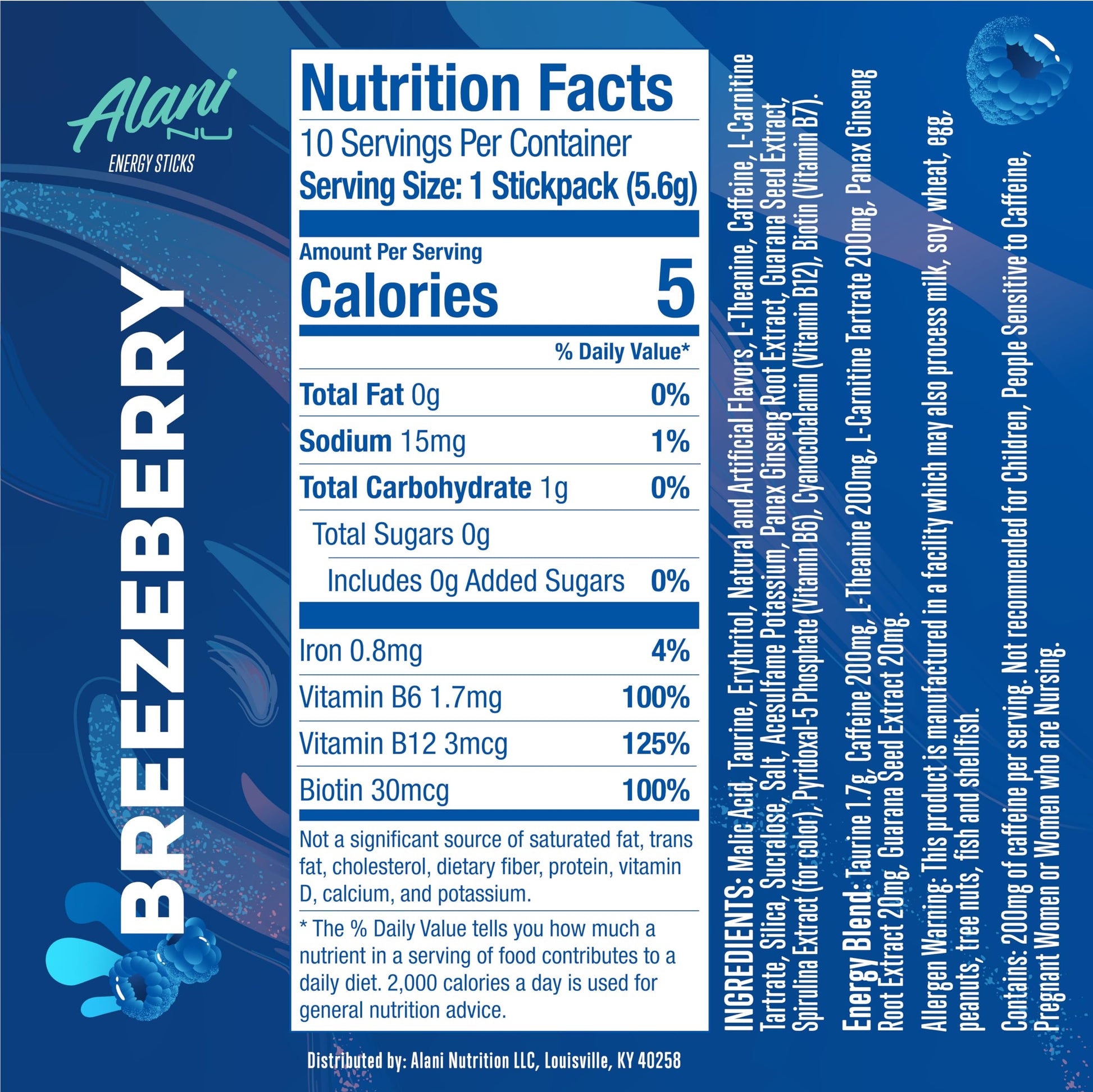Alani Nu BREEZEBERRY, Energy Sticks Drink Powder, 200mg Caffeine, Pre Workout Performance with Antioxidants, On-The-Go Drink Mix, Biotin, B Vitamins, Zero Sugar, 5 Calories, 10 Pack