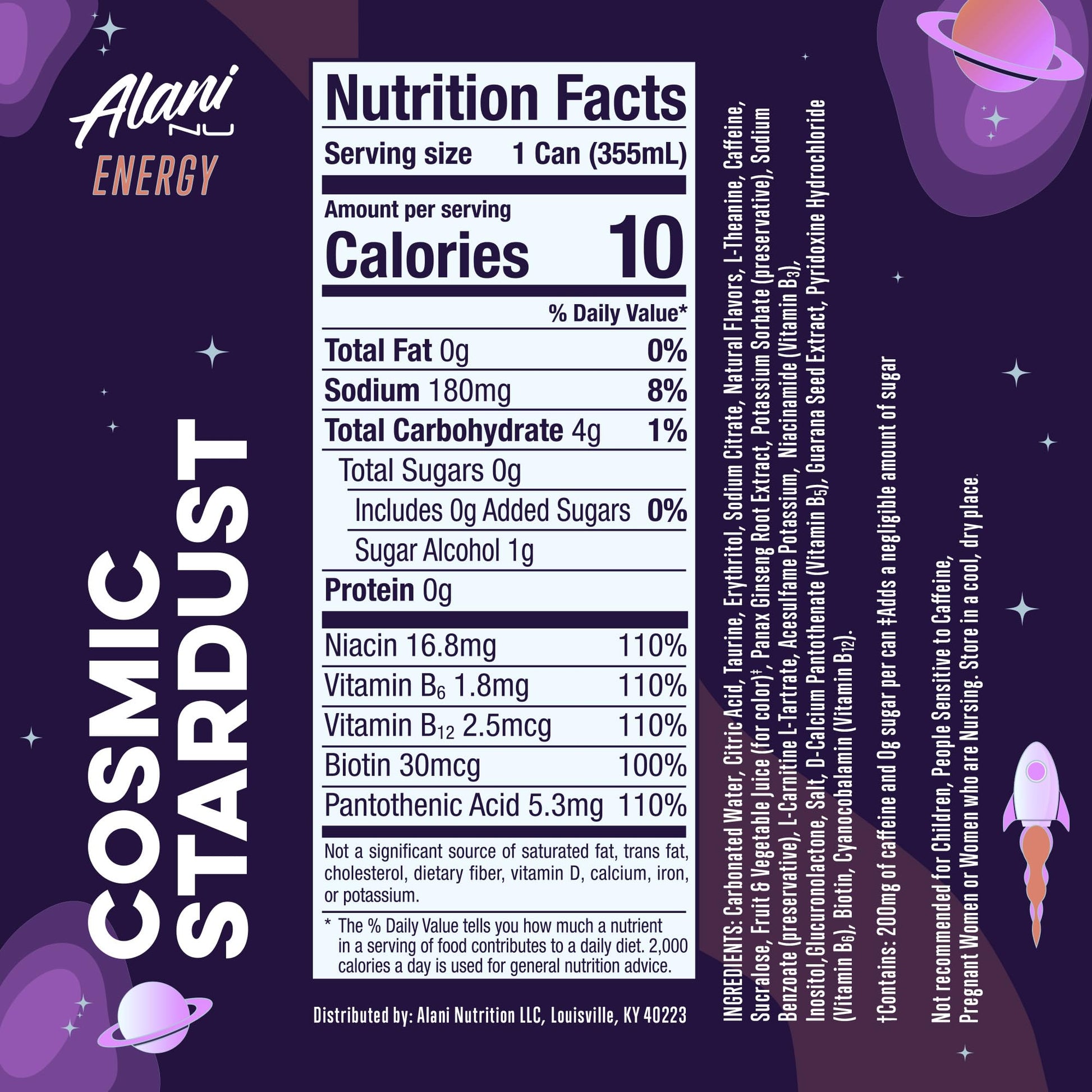 Alani Nu COSMIC STARDUST, Sugar Free, Low Calorie Energy Drinks, 200mg Caffeine, Biotin, B Vitamins, Zero Sugar, 10 Calories, 12 Fl Oz Cans, 12 Pack