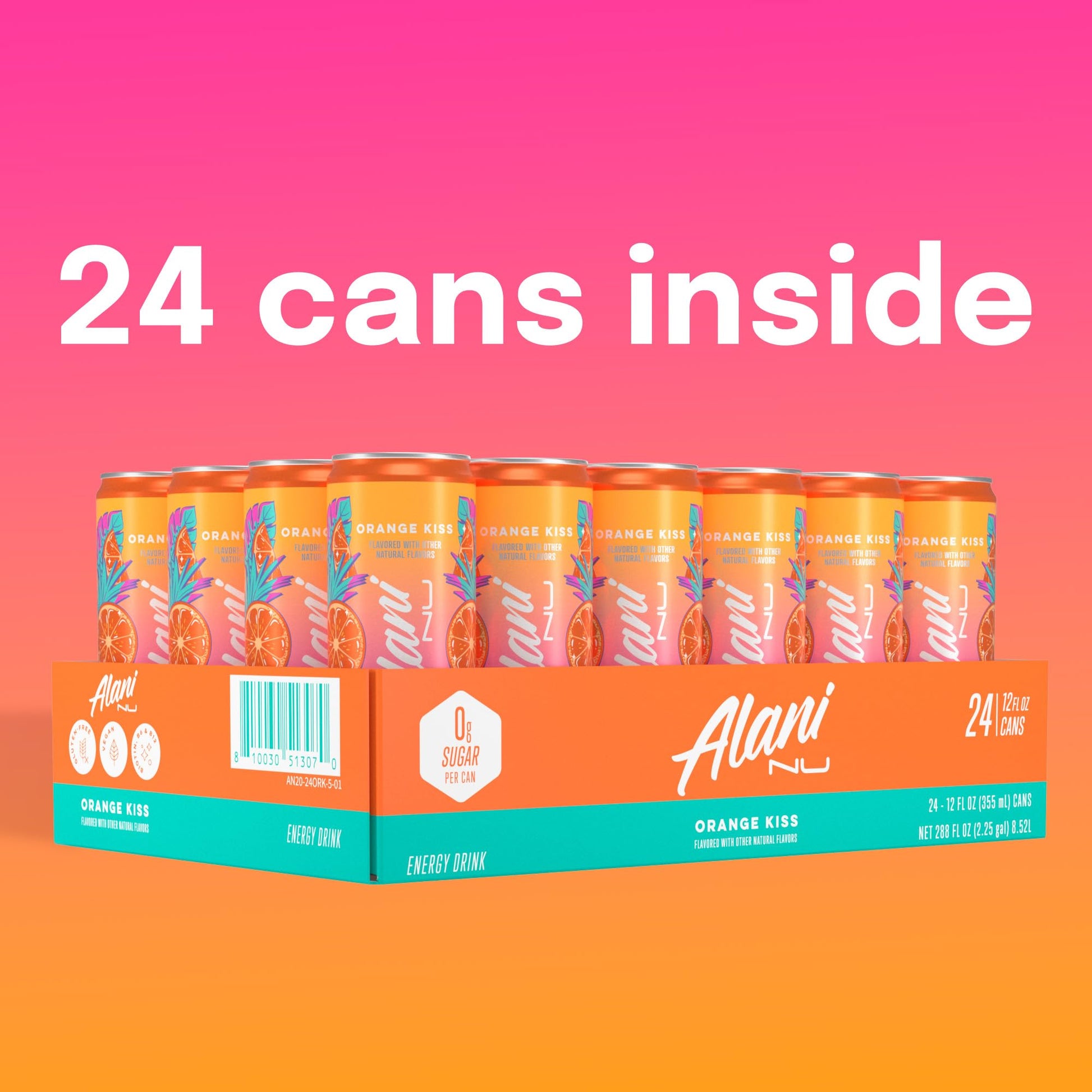Alani Nu ORANGE KISS, Sugar Free, Low Calorie Energy Drinks, 200mg Caffeine, Biotin, B Vitamins, Zero Sugar, 10 Calories, 12 Fl Oz Cans, 24 Pack