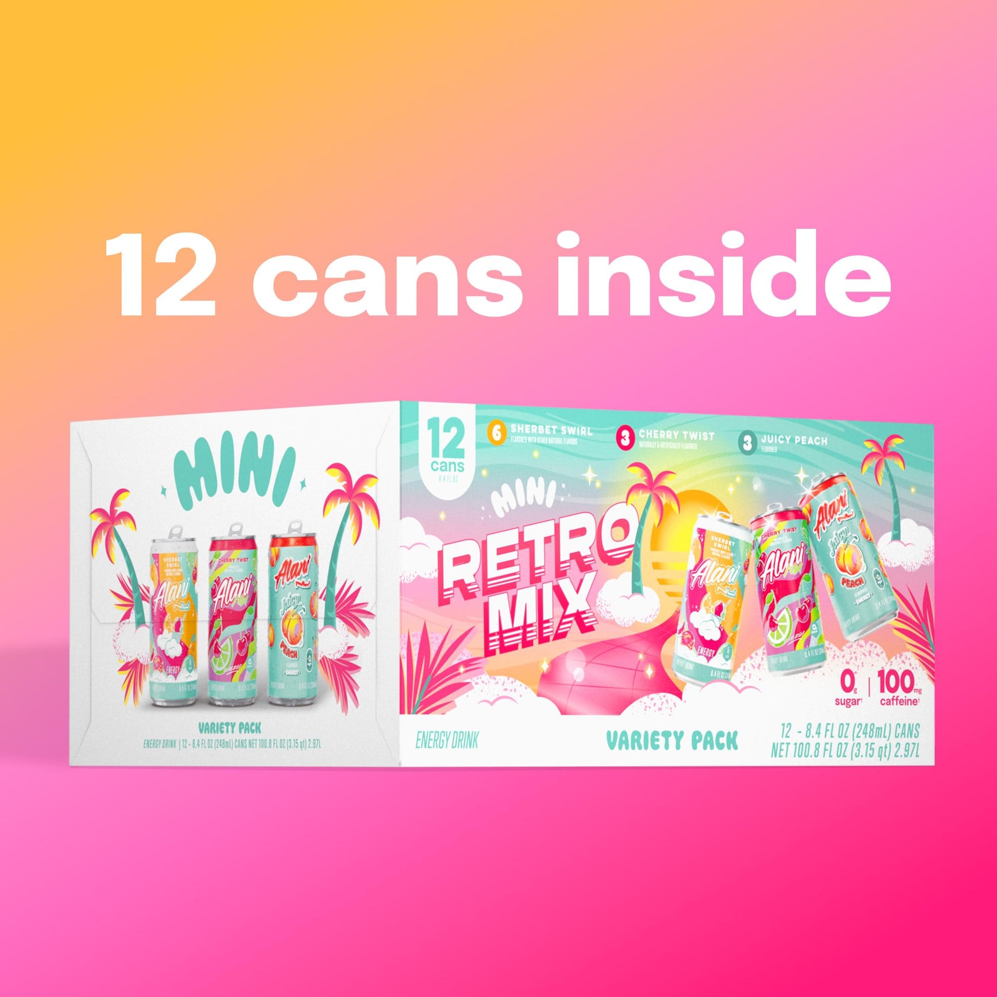 Alani Nu RETRO VARIETY PACK (Sherbet Swirl, Juicy Peach and Cherry Twist), Low Calorie Energy Drinks, 100mg Caffeine, Biotin, B Vitamins, Zero Sugar, 10 Calories or Less, 8 Fl Oz Cans, 12 Pack