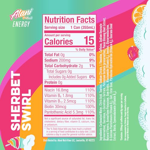 Alani Nu SHERBET SWIRL Sugar Free, Low Calorie Energy Drinks, 200mg Caffeine, Biotin B Vitamins, Zero Sugar, 10 Calories, 12 Fl Oz Cans, 24 Pack