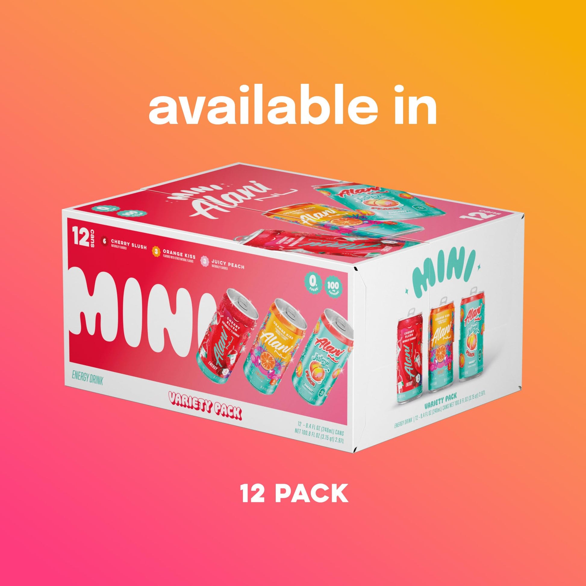 Details: Squeeze the most out of every little moment with Alani Nu Mini Energy—a tiny but mighty twist on our best-selling, zero-sugar boost. Each 8.4oz can contains 100mg of caffeine—half the kick of our 12oz Energy Drinks and perfect for when you're craving a lighter lift. We're big on better-for-you, so every can is sugar-free, gluten-free, vegan, and just 5-10 calories. We also added a splash of B vitamins to keep you feelin' charged while you're livin' large. And the taste? Just as juicy as ever! From Orange Kiss to Cherry Slush, Mini Energy serves up major waves of refreshingly fun flavor. Live a little and find your fav today!
