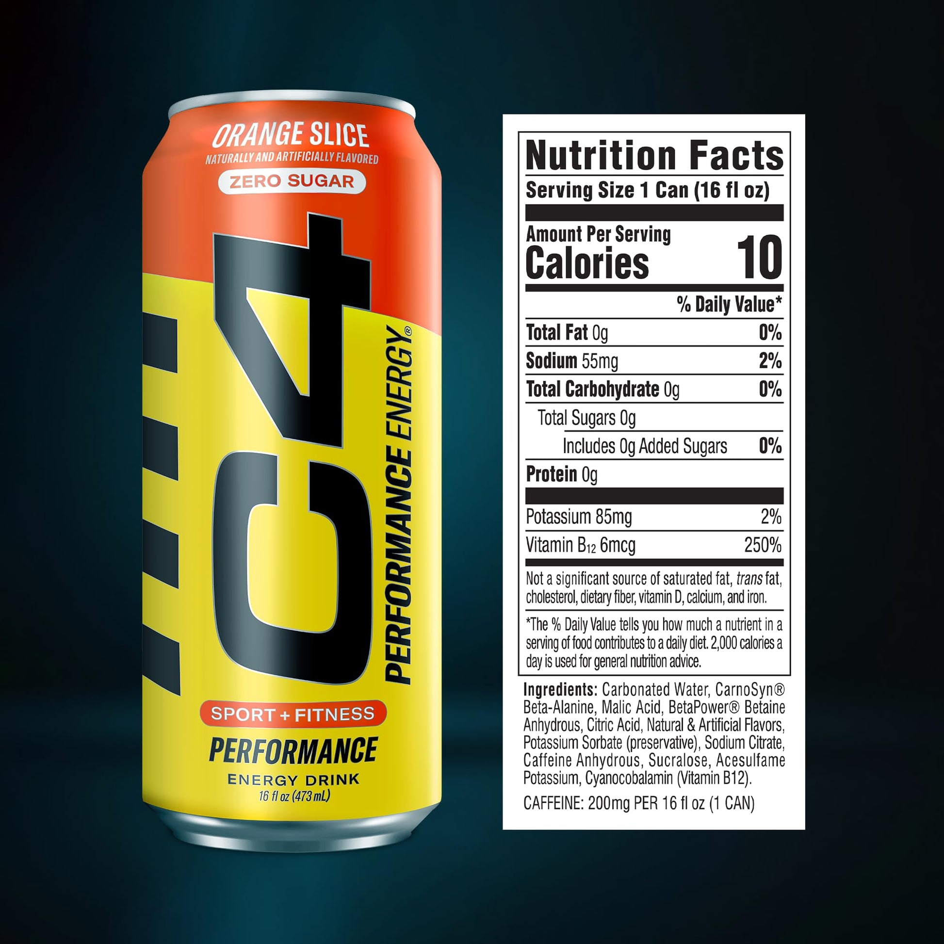 C4 Energy Carbonated Zero Sugar Energy Drink, Pre Workout Drink + Beta Alanine, Orange Slice, 16 Fl Oz (Pack of 12)