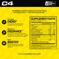 EXPLOSIVE ENERGY — Take your training to the next level with explosive C4 Energy from 150mg of caffeine. MUSCULAR ENDURANCE — Power tough trainings with CarnoSyn® Beta-Alanine, which helps combat muscular fatigue and support muscular endurance* INCREDIBLE FLAVORS — With billions of servings of C4 branded products sold, the C4 brand has been setting the standard for great flavor for over a decade.* PUMP BOOSTER — Enhance your pumps via a unique patented combination of Creatine and Nitrates. *Based on global sales of all C4 branded products from 2015 to the present.