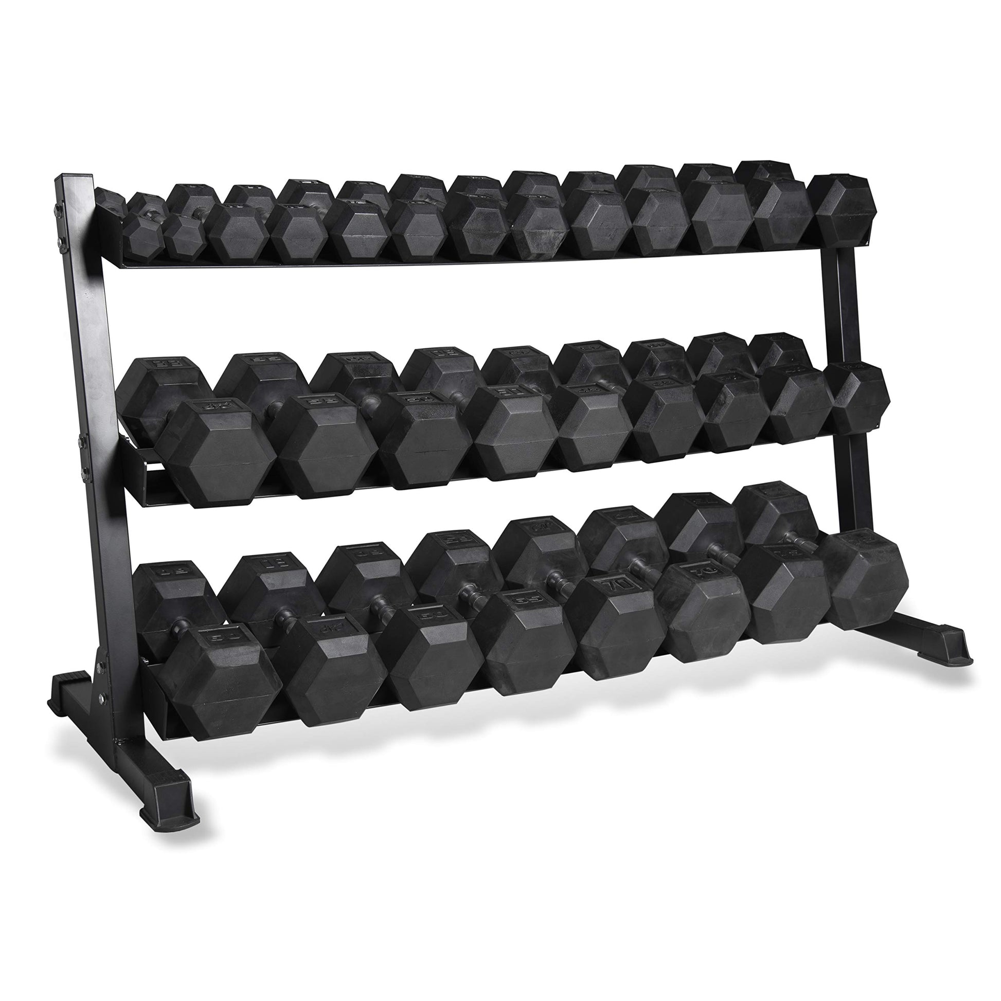 - SPACE-SAVING DESIGN – The Three Tier design of this rack maximizes floor space. Easily access and store dumbbells. Rubber inserts prevent dumbbells and rack from scratches