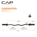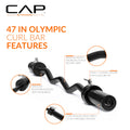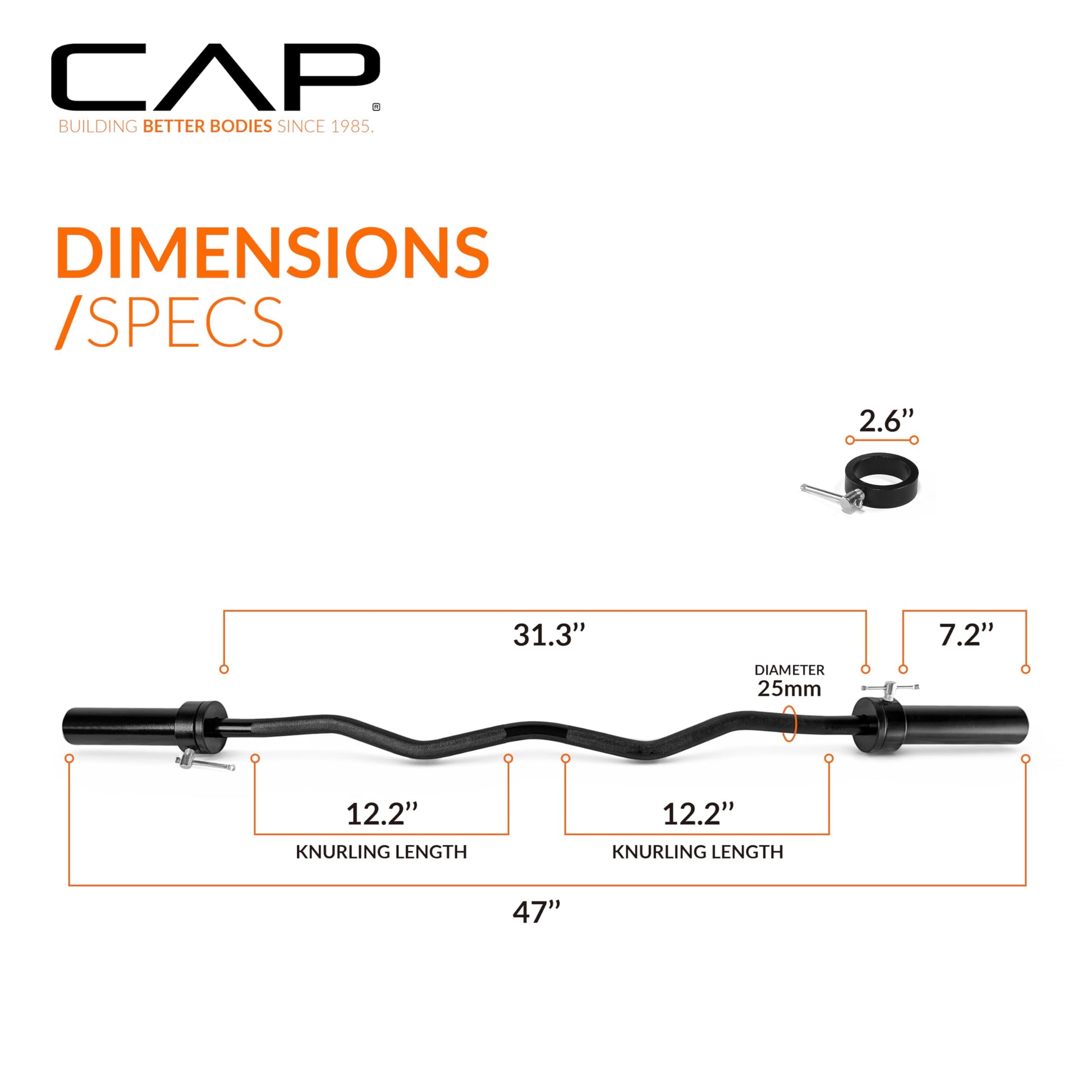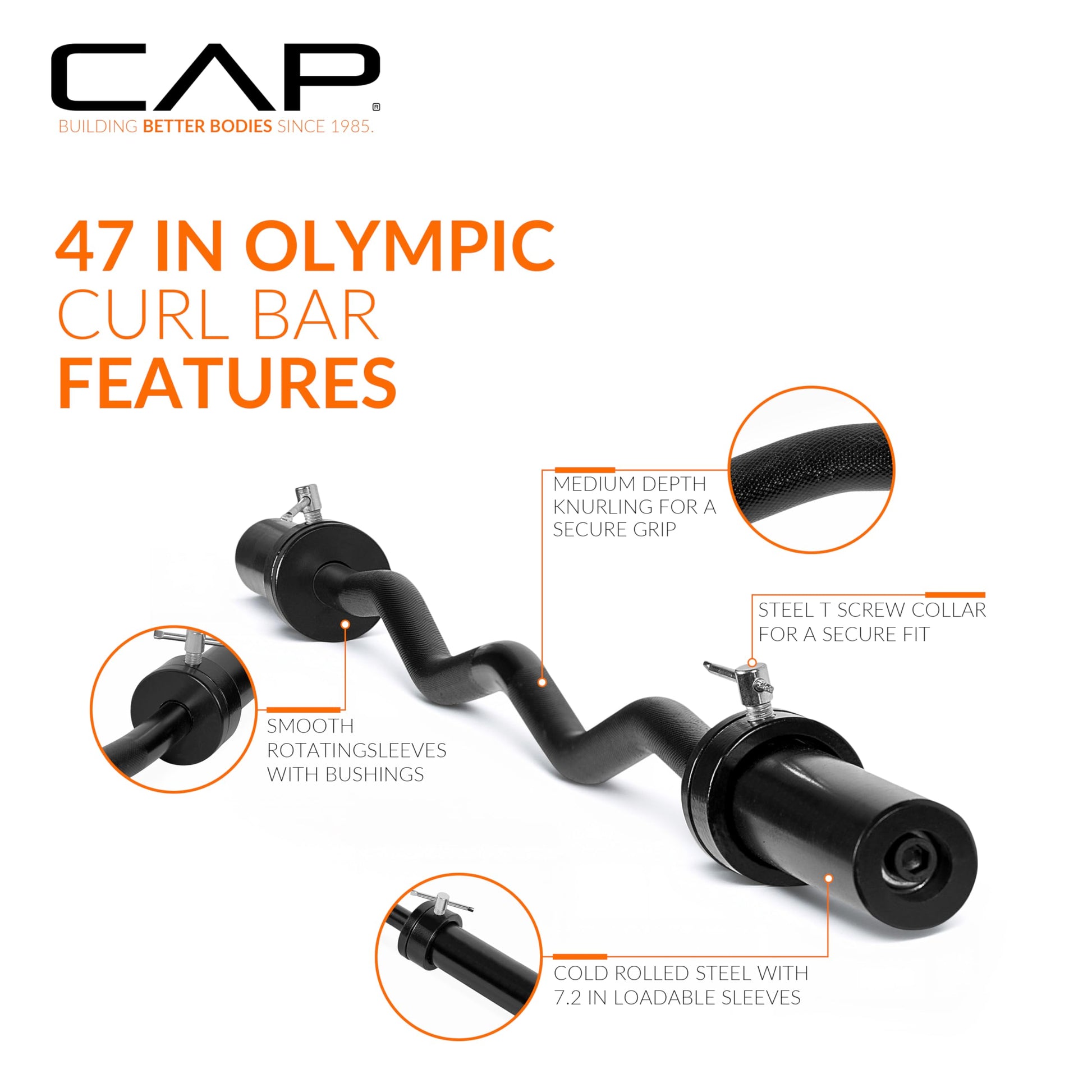 Details: The CAP Barbell 47-Inch Olympic Curl Bar is the ultimate tool for building bigger, stronger arms while reducing joint strain. Constructed from cold-drawn solid steel with a durable black powder coat finish, this Olympic curl bar is built to last through years of training. The medium-depth diamond knurling offers a secure, non-slip grip, while the 25.4 mm shaft accommodates all 2-inch Olympic weight plates, making it a versatile addition to any home or garage gym. Unlike a straight Olympic barbell, this EZ curl bar features a uniquely angled shaft design that reduces pressure on your wrists and forearms, allowing you to train more comfortably. Perfect for classic movements like EZ bar curls, preacher curls, skull crushers, and tricep extensions, this curling bar helps you target your biceps, triceps, chest, and back with precision. Engineered with revolving sleeves, the EZ curl bar Olympic design minimizes torque and protects both your joints and the bar itself. With a total length of 47 inches (1210 mm), a 33.25"" shaft, and 7.5"" loadable sleeves, this super curl bar is constructed from 51,000 PSI tensile strength steel and weighs 15.87 lb. It also features 6 inches of knurling on each side for a secure hold during every lift. For over 30 years, CAP Barbell has been trusted worldwide for durable and affordable strength training equipment. From EZ curl bars and Olympic barbells to weight plates and home gym essentials, CAP continues to be a leader in fitness innovation.