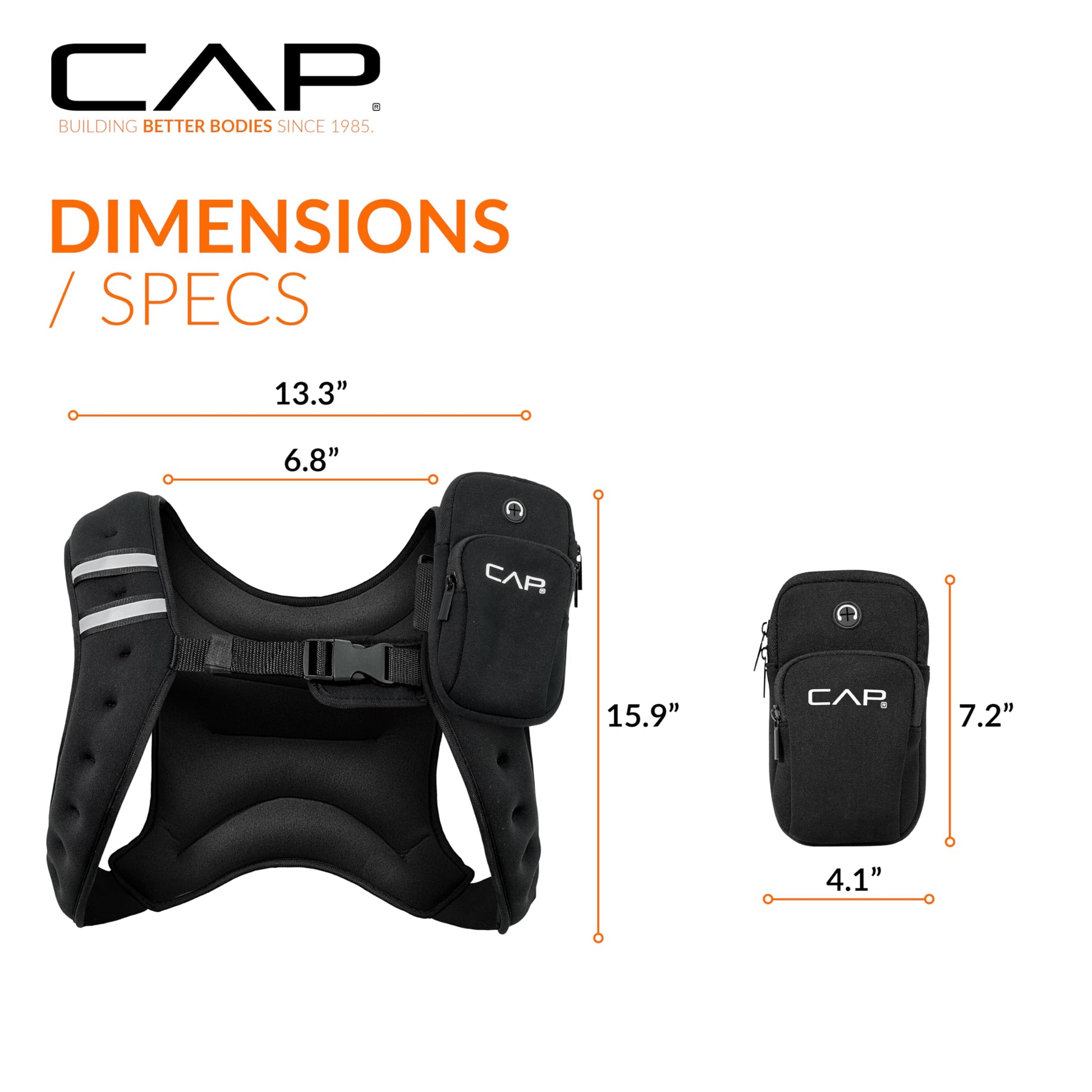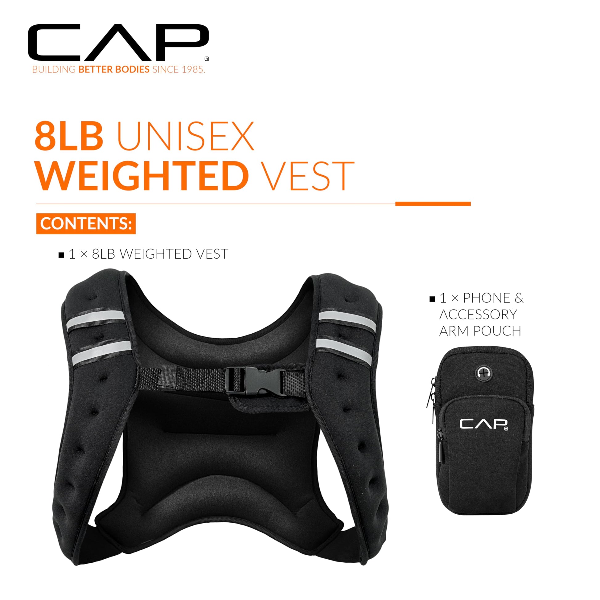 Details: Boost your workouts with the CAP Barbell 8LB Unisex Weighted Vest, designed to add intensity, resistance, and efficiency to any fitness routine. This versatile training vest is ideal for walking, running, cardio, cross training, bodyweight workouts, and strength training, helping you burn more calories and build endurance. The evenly distributed 8 pounds of weight ensures balanced resistance, while the elastic material and adjustable buckle closure deliver a secure and comfortable fit for both men and women. Reflective safety stripes increase visibility during outdoor workouts, and the included phone and accessory pouch keeps your essentials close at hand. Whether you’re training at home, in the gym, or outdoors, this weighted vest is the perfect way to add intensity to push-ups, pull-ups, lunges, squats, or runs. Trusted by athletes and fitness enthusiasts, CAP Barbell delivers high-quality workout gear built to perform. Take your training to the next level with the CAP 8LB Weighted Vest—the ideal blend of durability, functionality, and comfort.