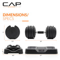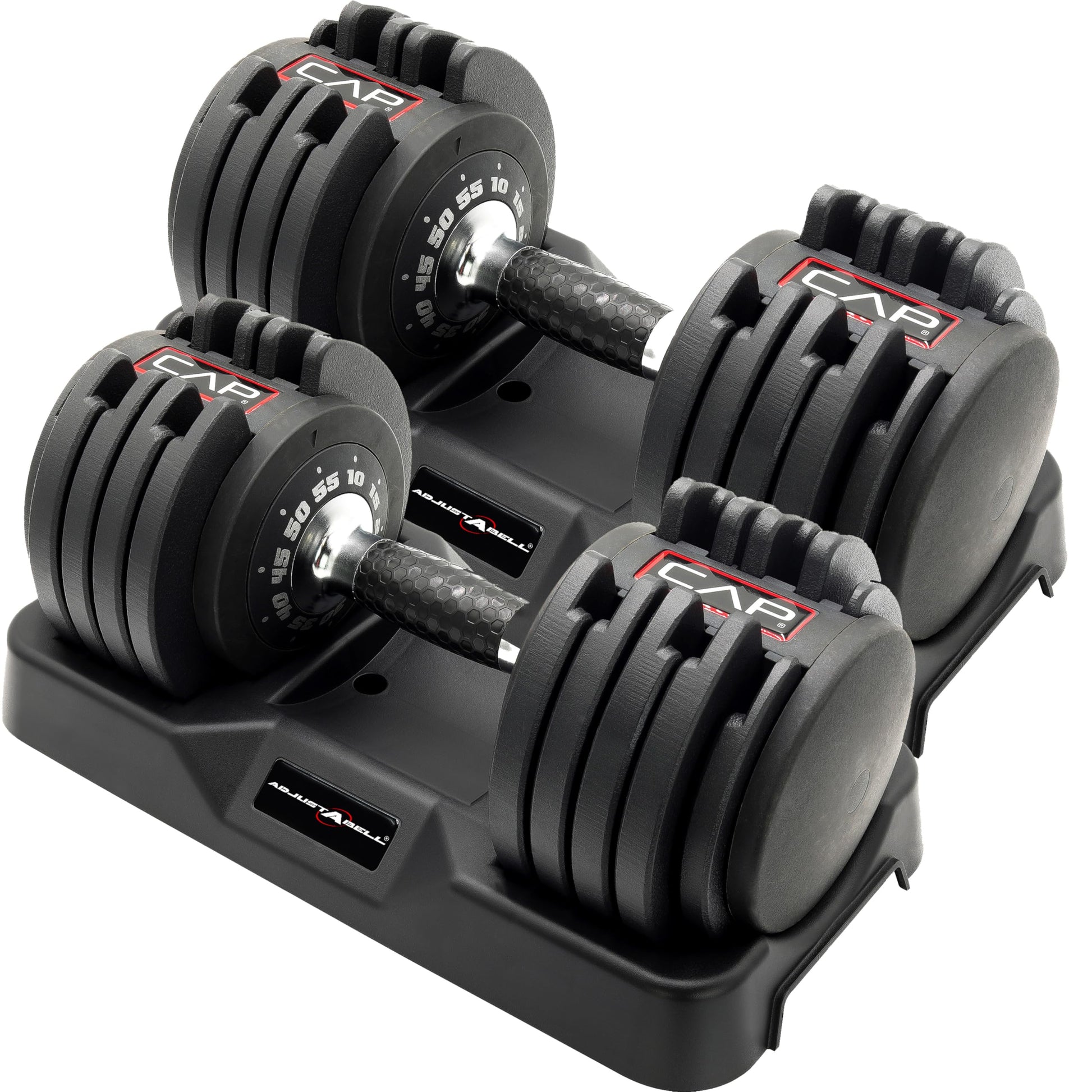 Details: Introducing the CAP 55 lb Pair of Adjustable Dumbbells with Contoured Full Rotation Handle that features the ADJUSTABELL weight adjustment system that is safe, quick, and easy to use! Simply turn the handle right or left to adjust the weight in 5 pound increments, pull up, and start your workout. Quickly and efficiently switch heavy weights for squats and lunges to lighter weights for curls and triceps extensions. No knobs to turn, pins to align, or levers to slide – just twist and go! The ADJUSTABELL weight adjustment system allows you to rapidly switch from one exercise to the next. The unique dial system combines 10 SETS of weights into ONE! The handles have a contoured, natural orientation for a comfortable, secure lifting position. Say goodbye to 10 sets of dumbbells and hello to the new ADJUSTABELL Dumbbell! US Patent 11,285,354