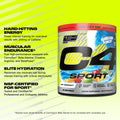 Details: Power up every training session with the upgraded C4 Sport pre-workout! Packed with extra active ingredients for hard-hitting energy, and fatigue-fighting muscular endurance, C4 Sport redefines high performance.* Every scoop delivers 200mg of hard-hitting caffeine for the explosive energy C4 is known for. Next, we combined 2g of CarnoSyn® Beta-Alanine, Creatine, Arginine, and BetaPower® Betaine to hit every rep with enhanced muscular endurance. Finally, the addition of critical electrolytes and key minerals are the fuel that power elite hydration. For hard-hitting training performance trusted by professional and collegiate athletes, fuel every workout with the new C4 Sport!