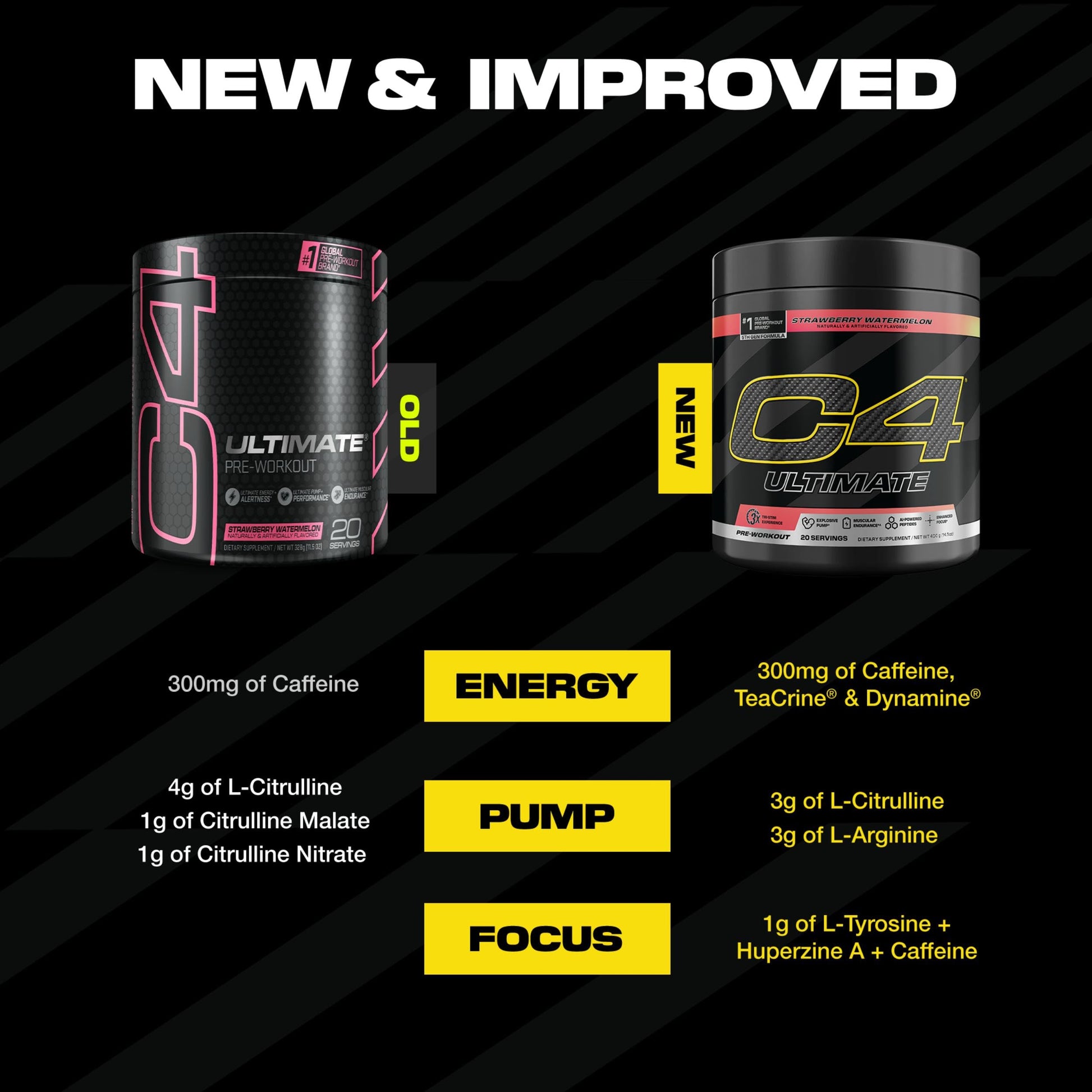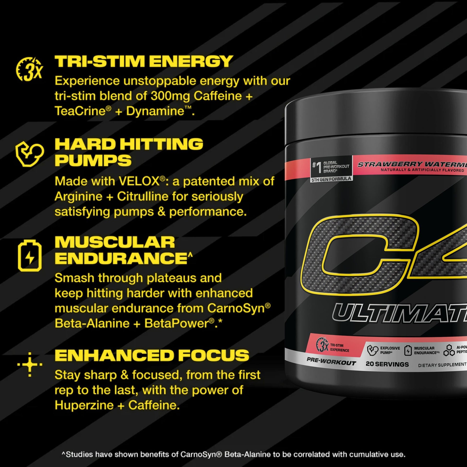 Details: Our most advanced and comprehensive pre-workout experience, C4 Ultimate is fully loaded with 300mg of caffeine, 6g Citrulline Pump Matrix, 3.2g CarnoSyn beta-alanine, and an array of additional supporting ingredients to deliver the ultimate in explosive energy, pumps, performance, and focus.