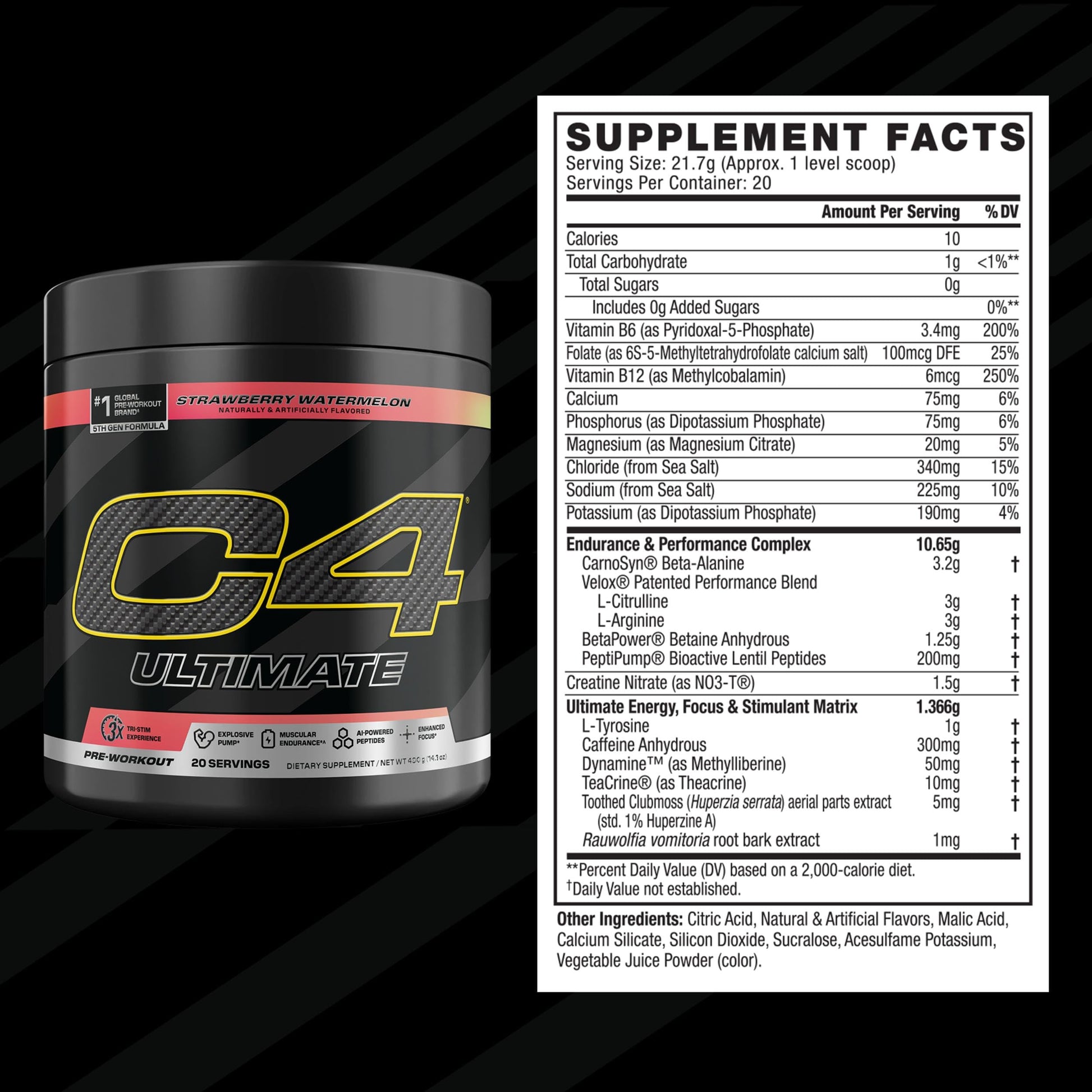 Cellucor C4 Ultimate Pre Workout Powder Strawberry Watermelon - Sugar Free Preworkout Energy Supplement for Men & Women - 300mg Caffeine + 3.2g Beta Alanine + 2 Patented Creatines - 20 Servings