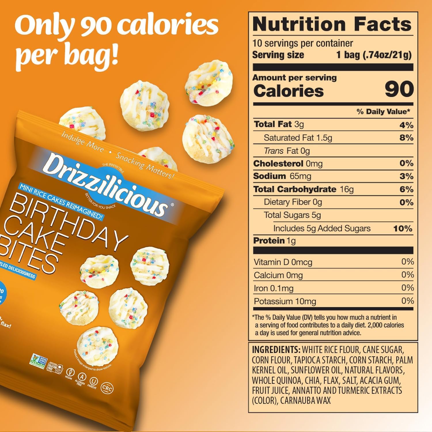 - LOW CALORIE DESSERT - Drizzlicious Mini Rice Cakes contain only 90 calories and 5 grams of sugar per bag. They're a better-for-you dessert alternative in individual bags for on-the-go snacking