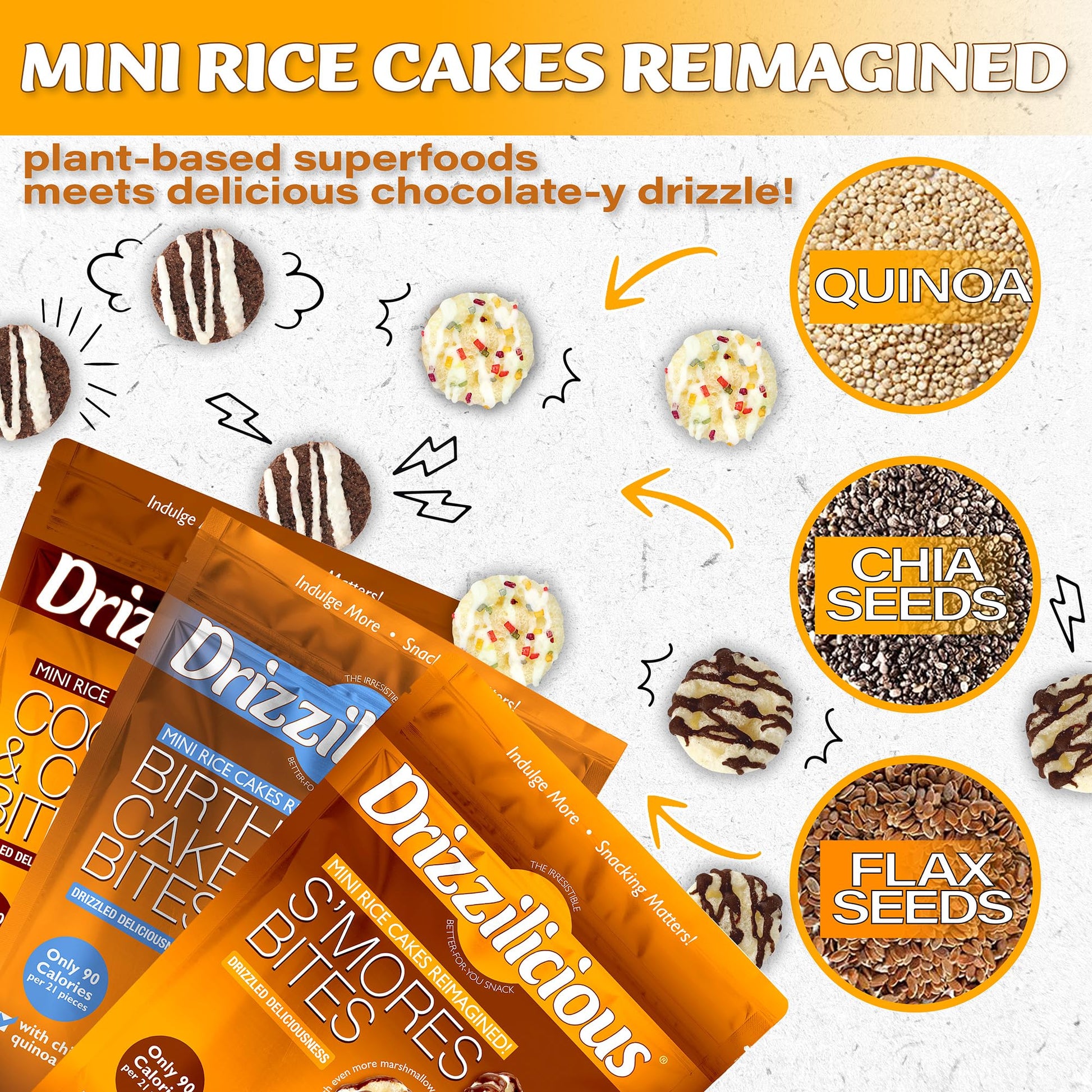 - VARIETY PACK - Our rice cakes are popped to perfection, made with plant-based ingredients, and drizzled in sweet sauce. Our variety pack includes 4 Cookies & Cream, 4 Birthday Cake & 4 S'mores Bites