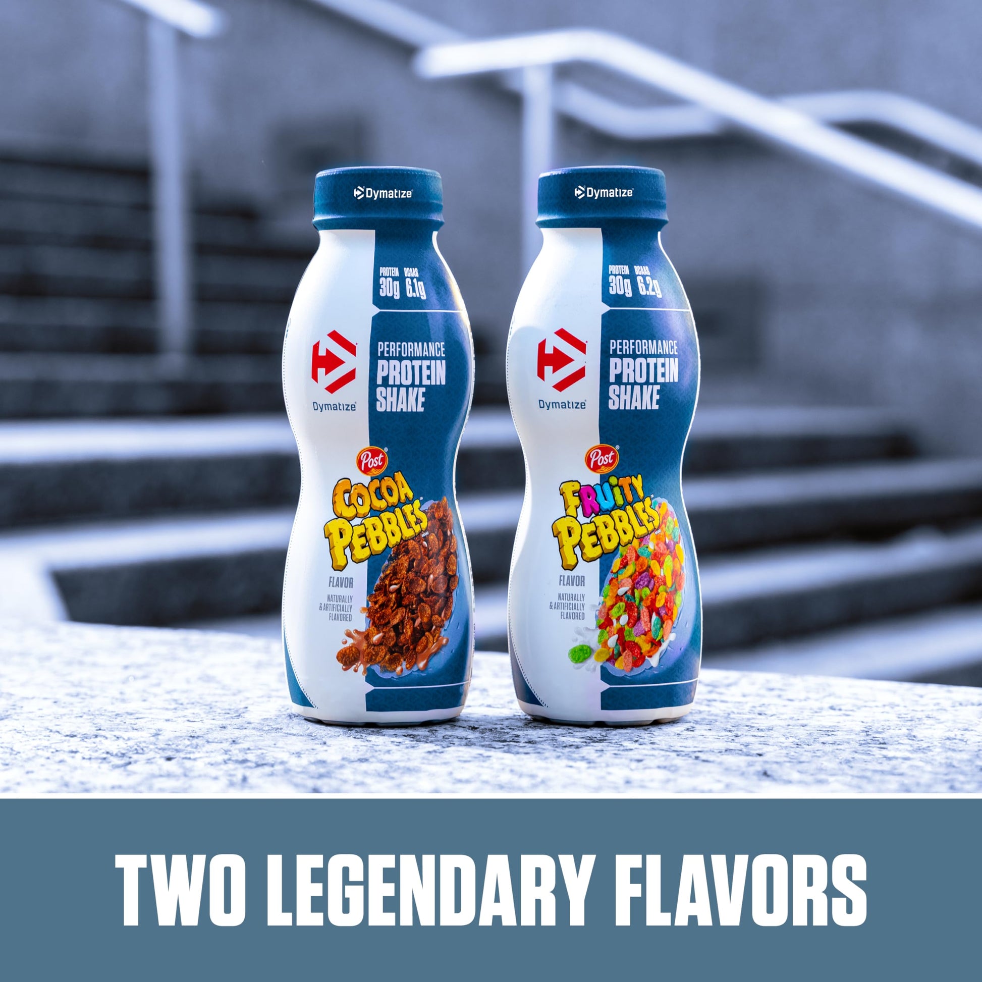 Details: ALL FUN AND GAINS! Dymatize Performance Protein Shakes are packed with all out PEBBLES™ flavor, 30g of high-quality protein, and muscle building amino acids. Formulated with a blend of fast and slow absorbing proteins for steady protein delivery, they're perfect for on-the-go, post-workout, or whenever you want a PEBBLES™ protein boost. Available in 2 delicious PEBBLES™ flavors: Fruity Pebbles and Cocoa Pebbles.