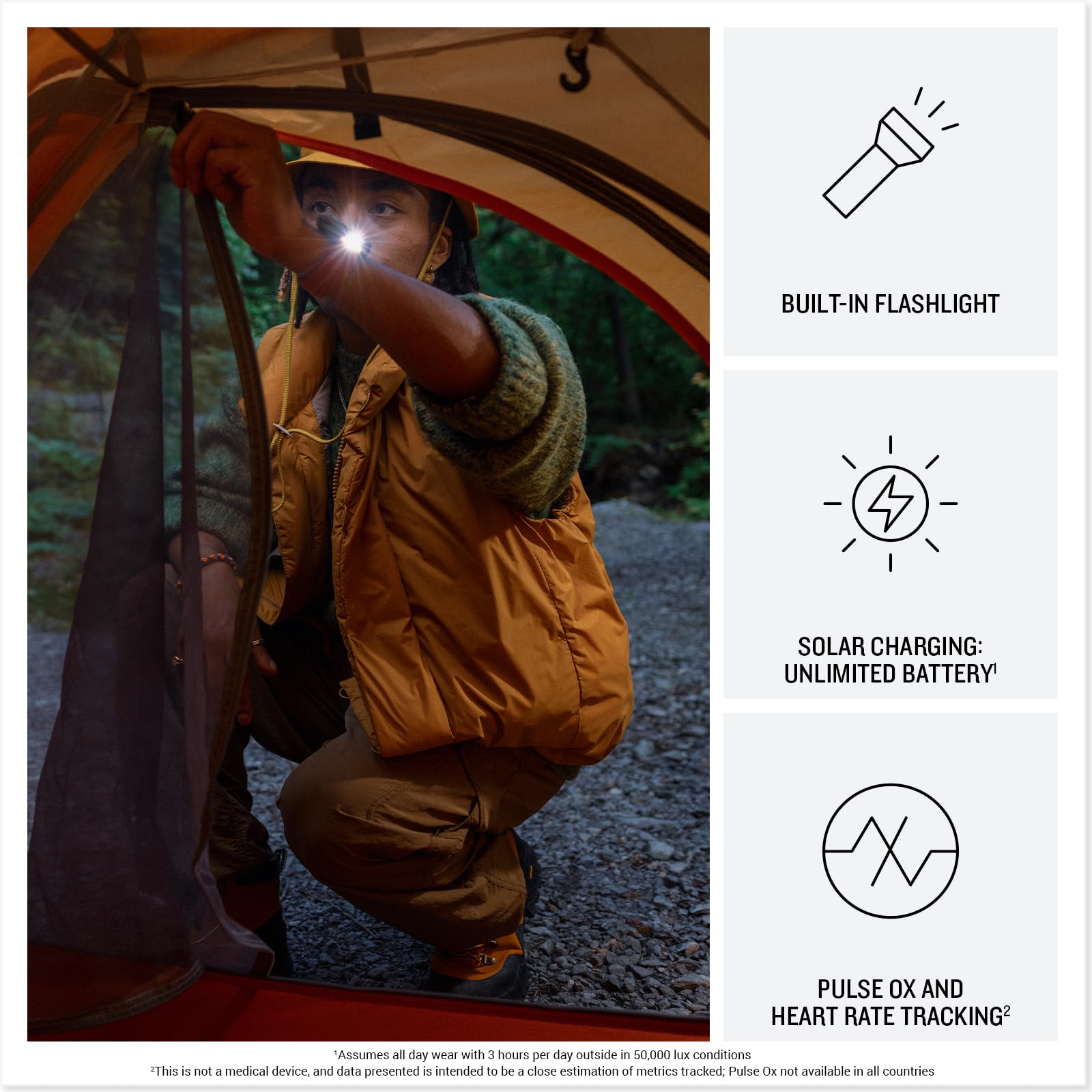 - Make a bold statement with this rugged GPS smartwatch, featuring a 0.9” display with solar charging lens and unlimited battery life with solar charging (assumes all-day wear with 3 hours per day outside in 50,000 lux conditions)