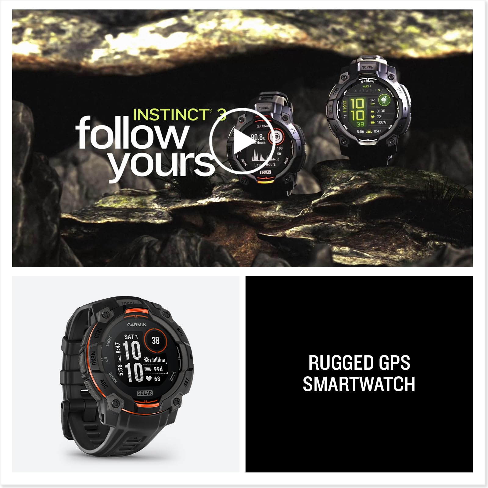 Details: Instinct® 3 is the rugged 45 mm GPS smartwatch with a 0.9” display, built-in flashlight and unlimited battery life in smartwatch mode with solar charging (assumes all-day wear with 3 hours per day outside in 50,000 lux conditions). With bolted construction, a metal-reinforced bezel and scratch-resistant lens, it can take on your toughest adventures. It’s engineered to MIL-STD-810 standards for thermal and shock resistance and is also 10 ATM water-rated. To keep you on track, the Instinct 3 smartwatch includes a built-in 3-axis compass and barometric altimeter. Plus, multi-band GPS with SatIQ™ technology delivers superior positioning while also optimizing battery life. Its 24/7 health and wellness features keep you connected to your body with heart rate tracking, advanced sleep monitoring, Pulse Ox and more (this is not a medical device, and data presented is intended to be a close estimation of metrics tracked; Pulse Ox not available in all countries). Instinct 3 also includes Garmin Pay™ contactless payments (with a supported bank).
