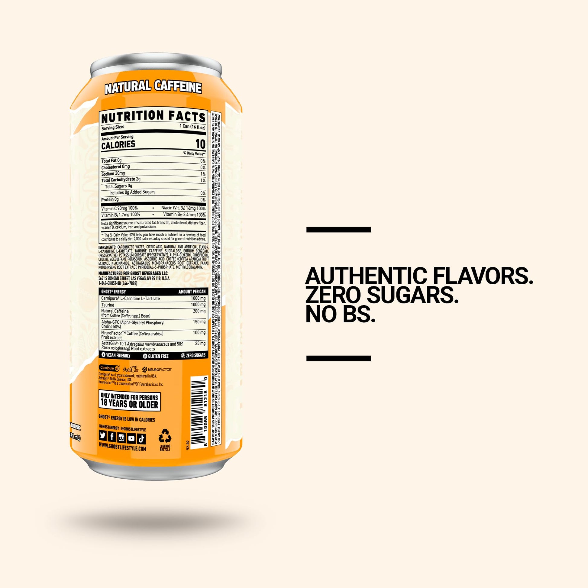 - Feel Good Energy: GHOST Energy is the fully transparent, fully loaded energy drink we’ve all been waiting for. Authentic Flavors. Zero Sugars.* No BS. Orange Cream flavor. 12-pack case contains 16oz cans. Only intended for persons 18 years or older. *GHOST Energy is low in calories.