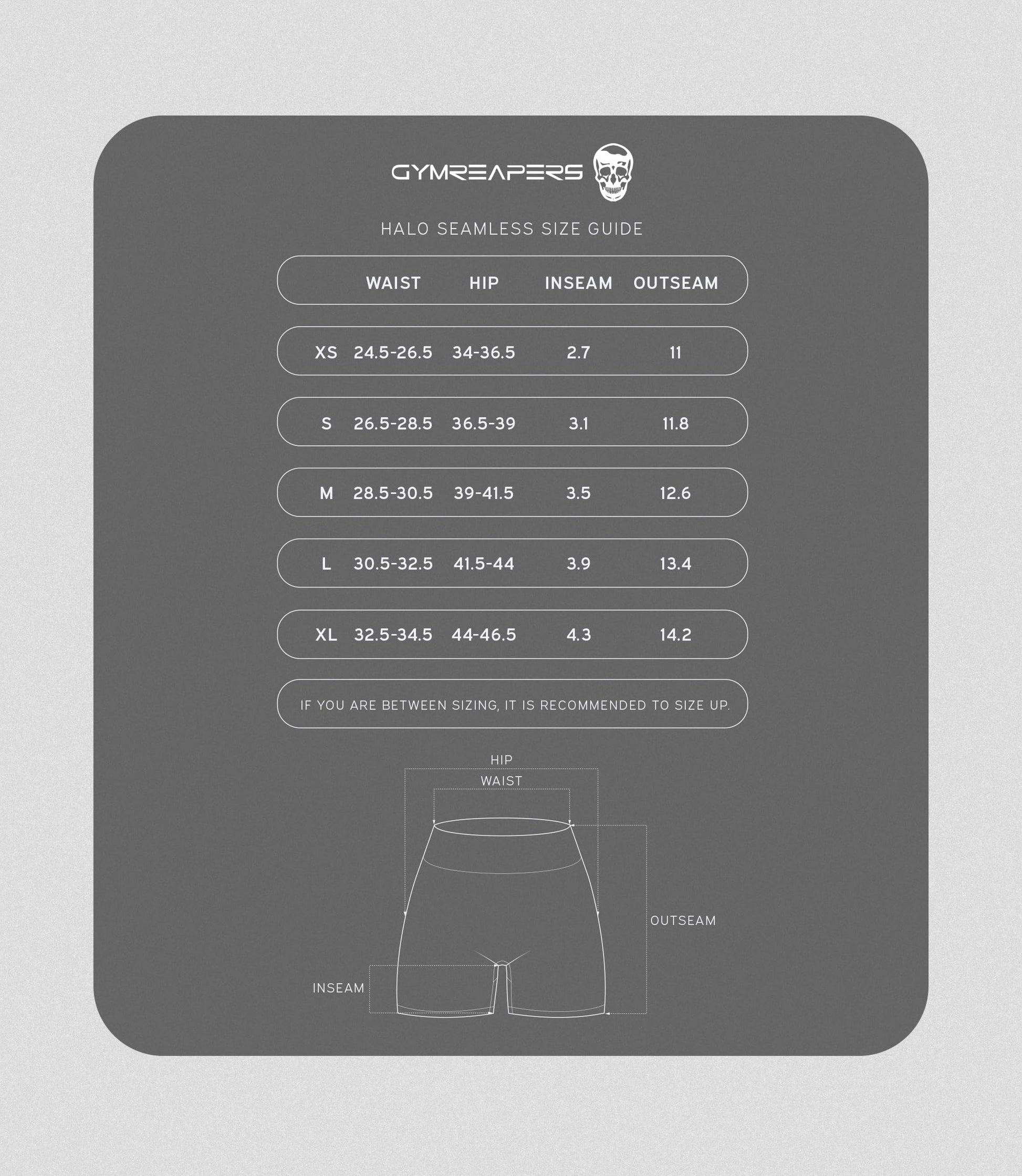 - GYMREAPERS HALO SEAMLESS SHORTS - Crafted with four-way stretch fabric and a diamond gusset crotch, these seamless workout shorts offer next-level breathability and mobility with no pinching or riding up. The graded inseam provides thigh coverage, reducing irritation and chafing during intense workouts. Soft enough for rest days and durable for training, they transition effortlessly from the gym to your daily routine.