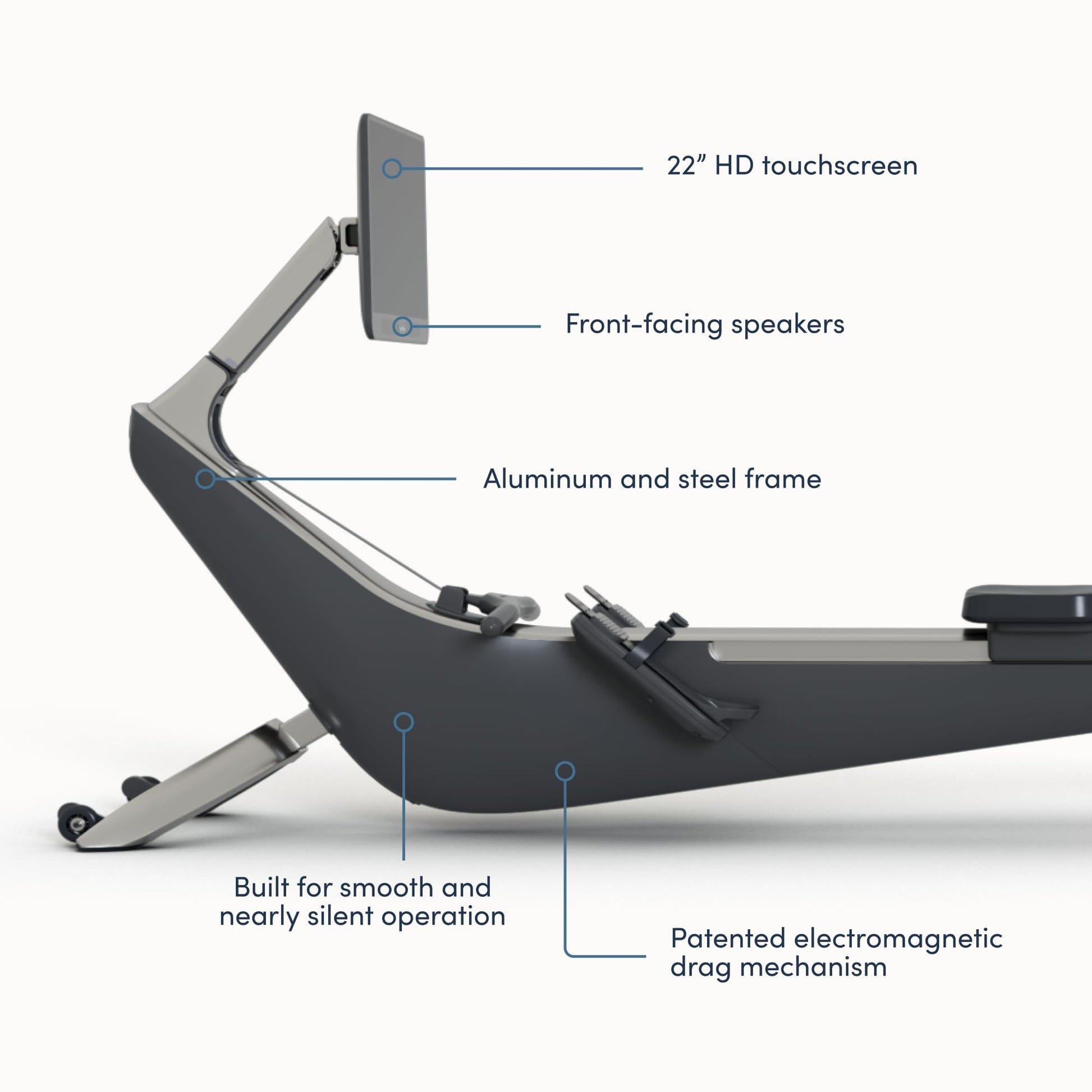 - Escape into every workout. The Origin’s patented electromagnetic drag technology is designed to mimic the feeling of rowing on water. And with a crystal-clear 22” HD rotating touchscreen display with front-facing speakers, the experience is about as immersive as it gets. Features include padded seat, adjustable foot straps, and a low-stress grip handle.
