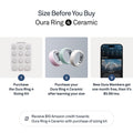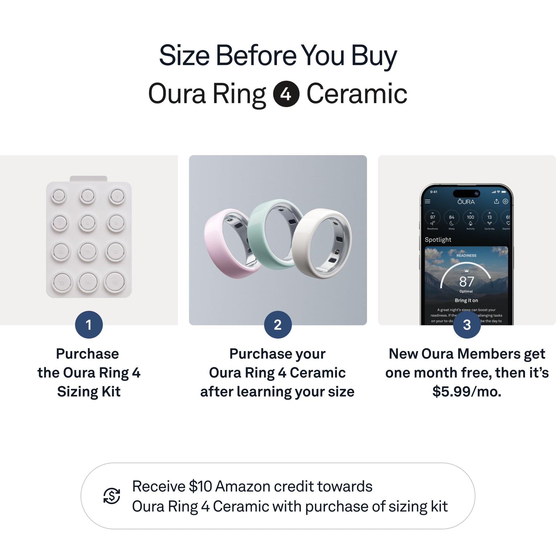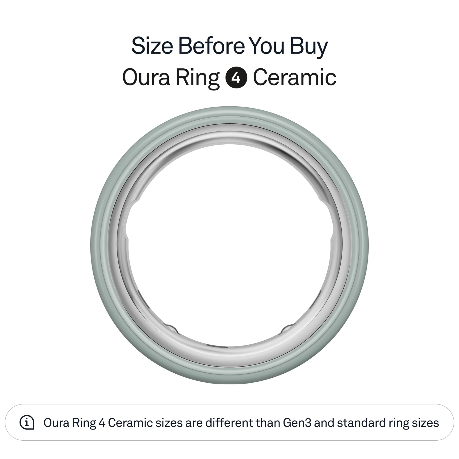 Details: Oura Ring 4 Ceramic is a modern expression of our revolutionary smart ring technology, blending refined elegance with everyday durability. The high-performance ceramic exterior is designed to keep up with you. The Ceramic Collection is available in sizes 4-15 and three unique colors: Petal, Tide and Cloud. Each new color is built to accent your style and personality. This colorful new take comes with the same cutting-edge technology of Oura Ring 4. Track over 50 health metrics and get personalized insights into your sleep, activity, readiness, stress, heart health, metabolic health, women's health and more. It is built around a breakthrough sensing technology, Smart Sensing, which adapts to your finger to deliver accurate, continuous data. With 5-8 days of battery life, you'll see a complete picture of your health. It's designed with recessed sensors on the interior, making it comfortable and gentle, even on sensitive skin. Oura Ring is FSA/HSA Eligible — we can accept FSA or HSA funds for the following: Oura Ring, additional chargers, and shipping. Oura Ring 4 Ceramic Polishing Pad: Keep your Oura Ring 4 Ceramic looking like new with the Ceramic Polishing Pad, redeemable once you sync your purchase in the Oura App. Due to the hardness of the zirconia ceramic, it can take on the color of softer metals, like a dumbbell or cookware. Over time, you may notice grey marks on your Oura Ring 4 Ceramic. Rest assured, it's not damaged — it's evidence of a metal transfer and easy to remove with proper cleaning. Use caution when handling metal objects and consider removing your Oura Ring for some activities. The Oura Ring 4 Ceramic Polishing Pad is your partner in keeping your ring in top condition. IMPORTANT: Size yourself with the Oura Ring Sizing Kit before you buy — Oura Rings are not US standard sizing, and finding the right size will result in the best experience possible. With a sizing kit purchase, a credit will automatically be applied to your Oura Ring at checkout.