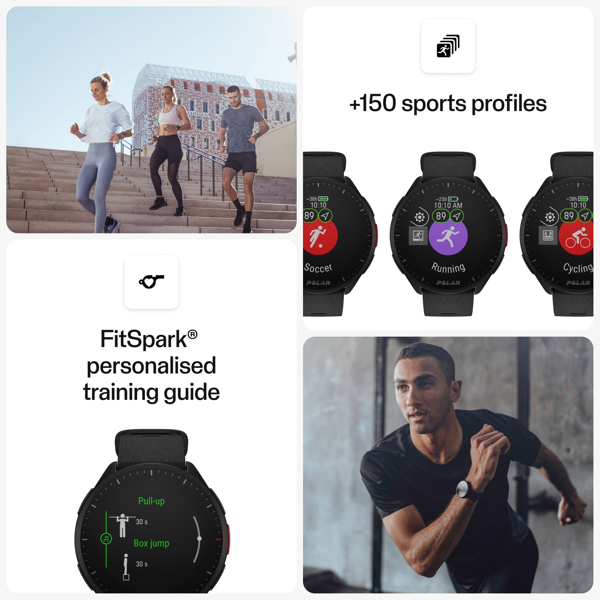 - Provides essential tracking for runners including time, pace, distance, laps, stopwatch on a crystal clear, always-on, MIP color display