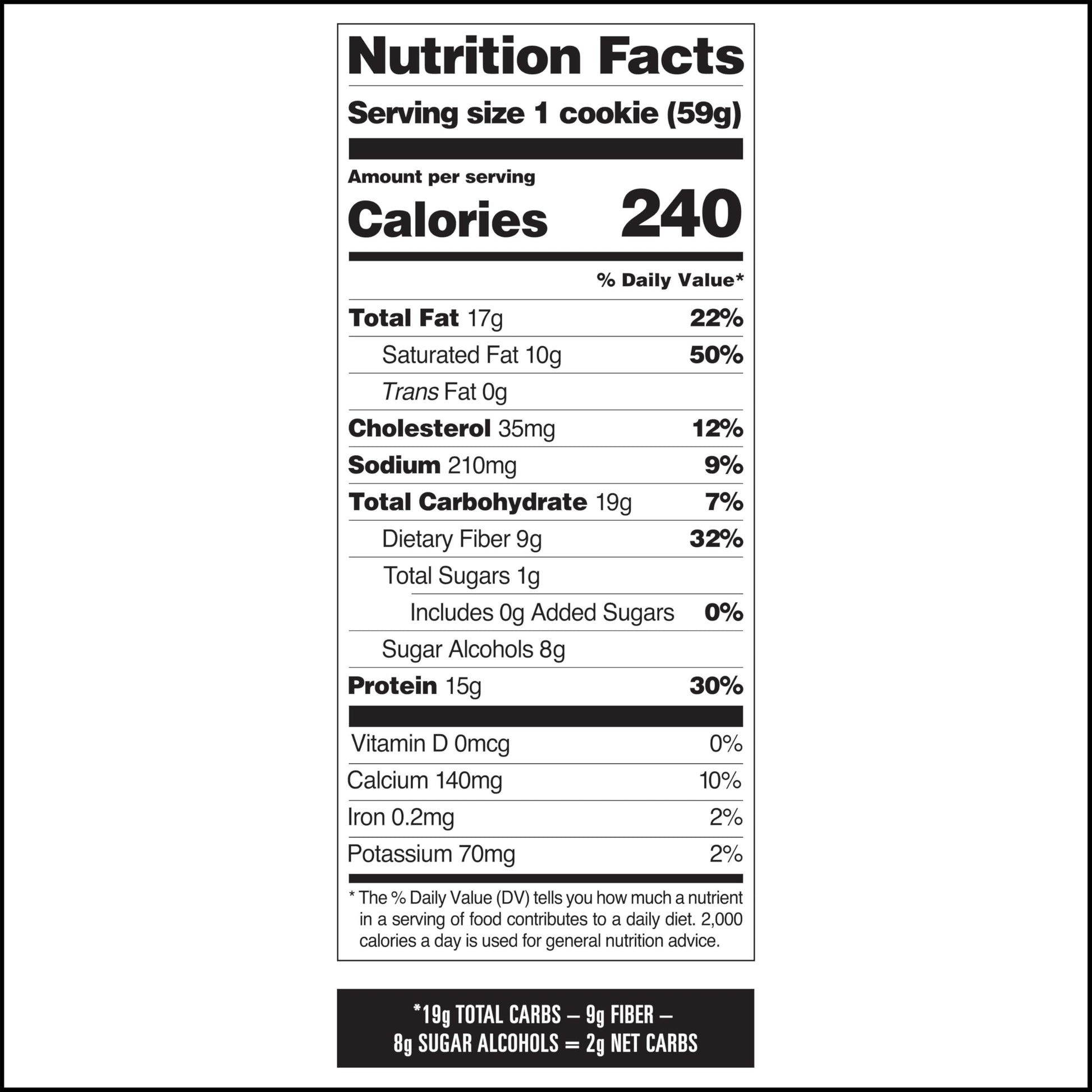 - PROTEIN FORWARD. 15g of protein, 1g of sugar, and 2g of net carbs per serving*. It’s the deliciously sweet, easy-breezy cheat to support your fitness goals while living the chocolate chip cookie dream.