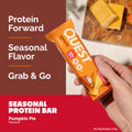 Details: Cheat on holiday treats with holiday treats. Ques Pumpkin Pie Protein Bars have a delicious pumpkin flavor with warm spice notes. Each decadent bar has 20g of protein, 4g net carbs, and 1g of sugar*. Seasonal spices and the delectable taste of pumpkin pie flavor are back. Quest Pumpkin Pie Protein Bars won’t be around for long, so get this great flavor while you can. *Per serving. See Nutrition Facts for Calories and Saturated Fat Content.