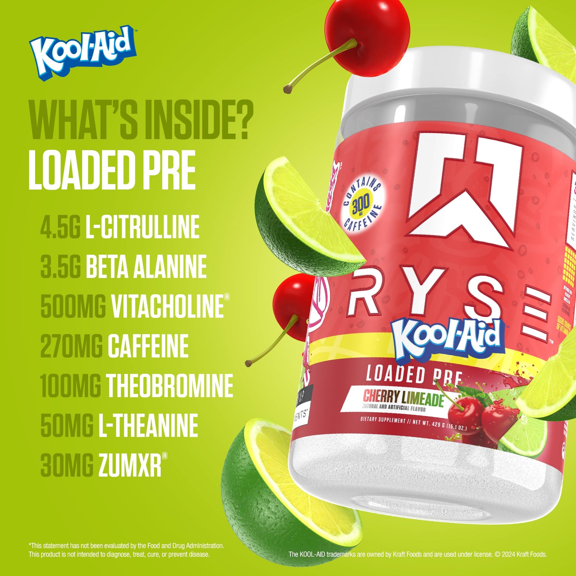 RYSE Loaded Pre Workout Powder - Kool-Aid Cherry Limeade - Daily Pre-Workout for Men & Women with 300mg Caffeine, Beta Alanine, and Citrulline for Pump, Focus, and Energy - 30 Servings