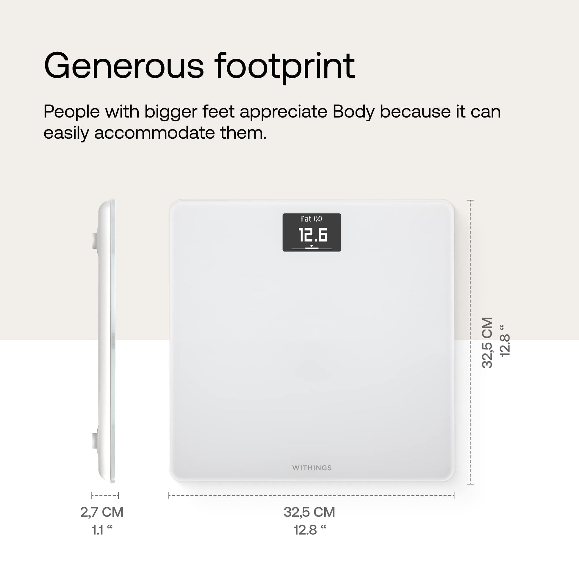 Details: Body is a Wi-Fi smart scale that features weight (+-0.1kg), BMI, and automatic syncs to the free Health Mate app (iOS8+ and Android 5+), where you can view trends and find extra motivation to reach your goals. Syncs with Apple Watch plus more than 100 top health and fitness apps including Apple Health, Fitbit and Google Fit.